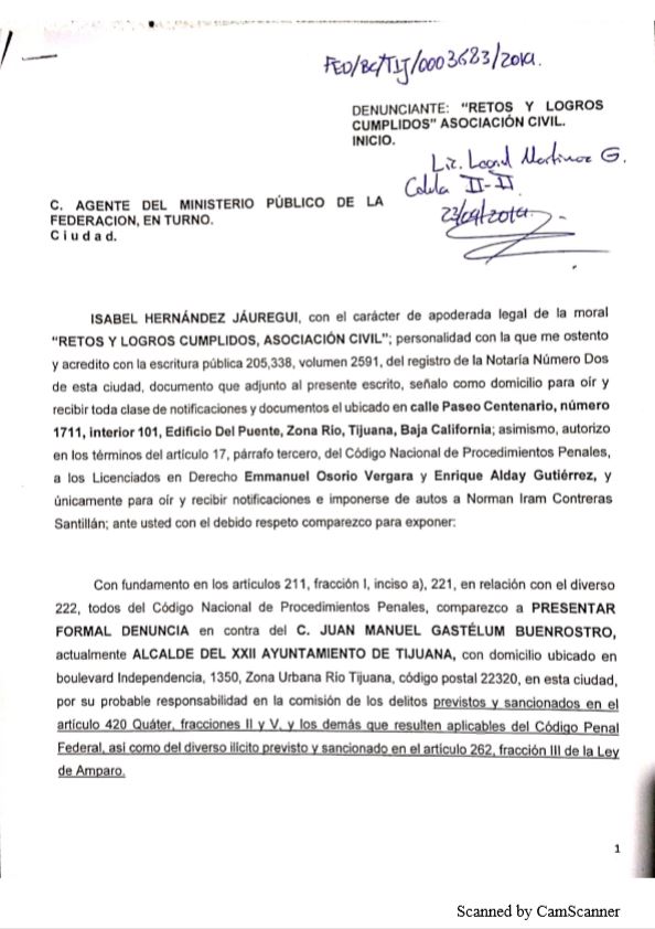 Tijuana.- La Asociación Civil “Retos y Logros Cumplidos” presentó una denuncia en la Fiscalía General de la República (FGR) en contra del Alcalde de Tijuana, Juan Manuel Gastélum Buenrostro, por la comisión de diversos ilícitos.