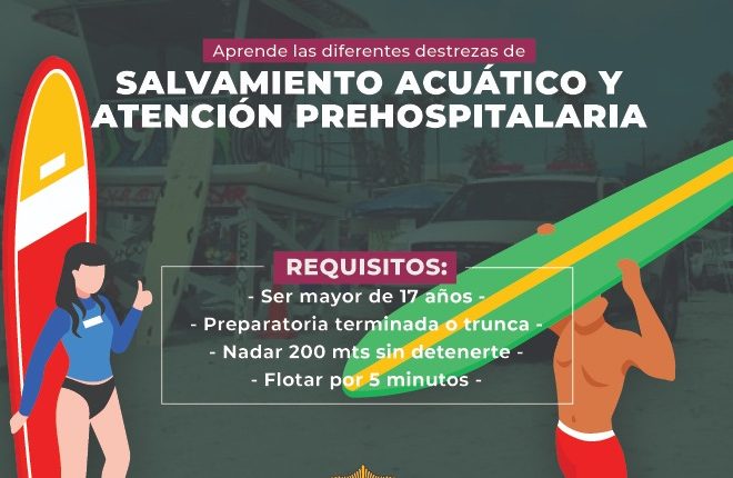 Playas de Rosarito.- El Gobierno Municipal, que encabeza Araceli Brown Figueredo, a través de la Dirección de Protección Civil y Bomberos, extiende la invitación a las personas interesadas en aprender las diversas destrezas de Salvamento Acuático y Atención Prehospitalaria, de la Escuela de Salvavidas de Playas de Rosarito.