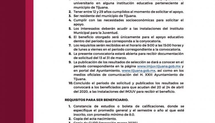 La selección se publicarán en la página www.imjuv.tijuana.gob.mx o bien, en la página del Ayuntamiento www.tijuana.gob.mx para que los beneficiados acudan del 20 al 24 de abril por su apoyo a las instalaciones del Imjuv.