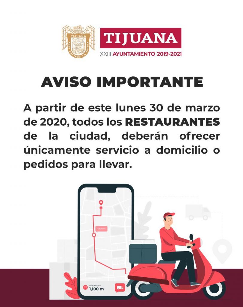 Tijuana. – A partir de este lunes 30 de marzo, los restaurantes de la ciudad deberán ofrecer únicamente servicio de pedidos a domicilio o para llevar a sus comensales, como parte de las medidas sanitarias implementadas por el presidente del XXIII Ayuntamiento de Tijuana, Arturo González Cruz.