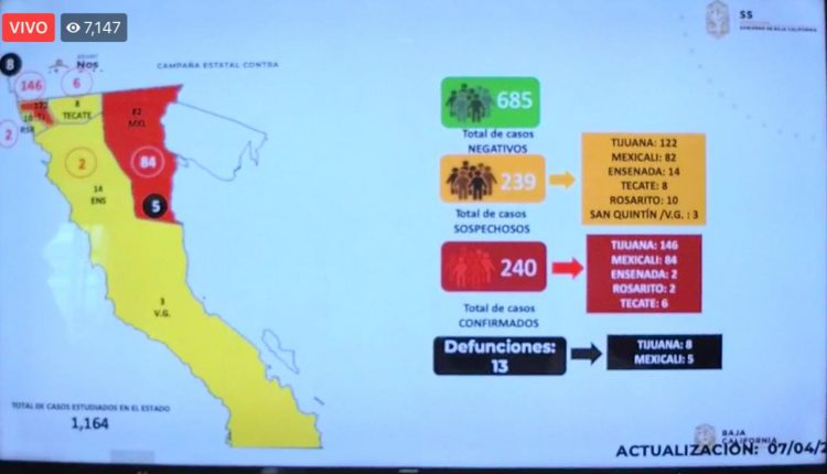 De estos 240 casos positivos, 146 se encuentran en Tijuana, 84 Mexicali, 2 Ensenada, 2 Rosarito, 6 Tecate.