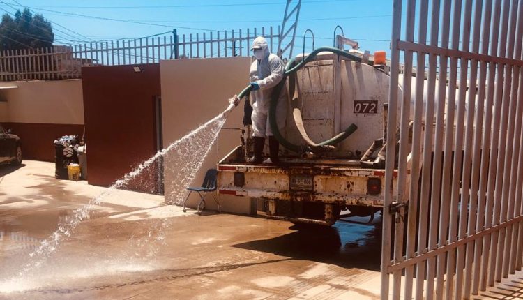 Playas de Rosarito B.C.- Con la finalidad de mantener las instalaciones limpias y así evitar la propagación de COVID-19, la secretaria de seguridad ciudadana en el V. Municipio realizo este día la sanitización del patio y el exterior de las instalaciones.