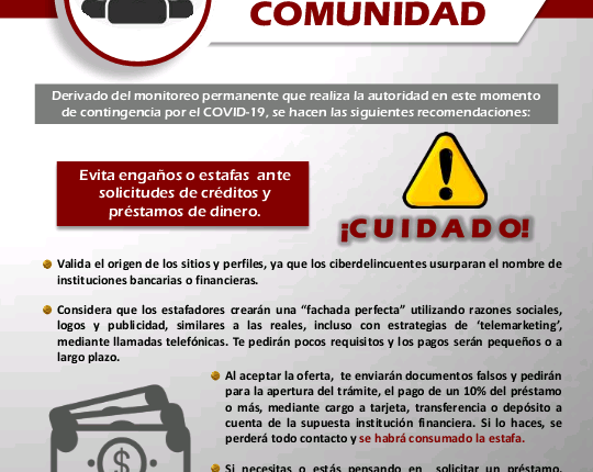 ENSENADA.- Derivado del monitoreo cibernético permanente que la Fiscalía General del Estado (FGE), realiza durante la fase de contingencia por COVID-19 en el Estado, se detectó una nueva modalidad de estafa sobre solicitud y oferta de créditos o préstamos monetarios.