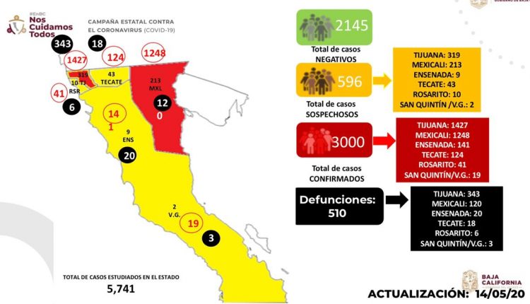Tijuana.-De acuerdo al reporte otorgado por el Secretario de Salud en el Estado, hasta la mañana de este viernes 15 de mayo 2020 existe en el estado un total de 3,000 casos positivos de COVID-19, de los cuales 1427 se encuentran en Tijuana, 1248 en Mexicali, 141 Ensenada, 124 Tecate, 41 Rosarito y 19 San Quintín.