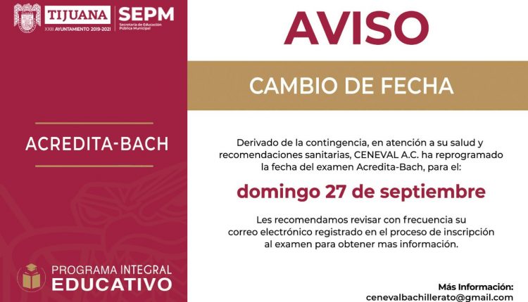 Tijuana.- Como parte de las medidas que respalda el presidente municipal, Arturo González Cruz, para garantizar la salud de la ciudadanía durante la pandemia, el XXIII Ayuntamiento de Tijuana, en coordinación con Ceneval A.C., informa la reprogramación del examen Acredita-Bach, se contempla para el próximo 27 de septiembre en la secundaria Adolfo López Mateos.