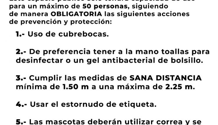 El máximo de personas que podrán estar en el parque es de 50, todas con uso de cubrebocas, así como contar en todo momento con toallas desinfectantes o gel antibacterial y conservar una distancia mínima de un metro y medio.