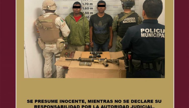 Playas de Rosarito, B.C.- Agentes de la Policía Municipal en coordinación con la Guardia Nacional y SEDENA detienen a dos sujetos con armas de fuego.