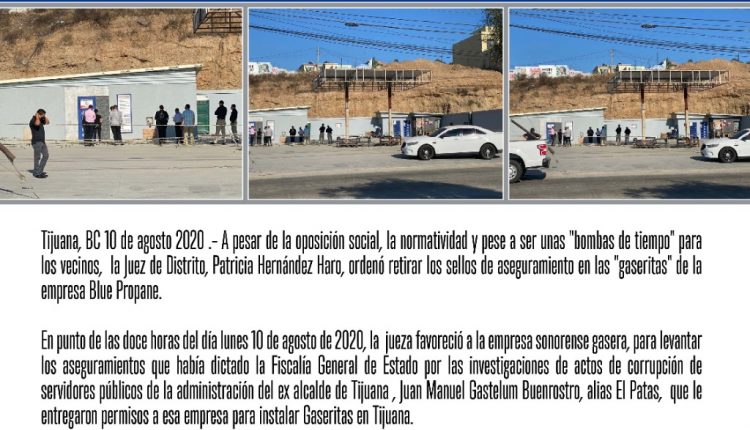 En punto de las 12 horas del día Lunes 10 de agosto del 2020, la jueza favoreció a la empresa sonorense gasera, para levantar los aseguramientos que había dictado la Fiscalía General del Estado por las investigaciones de actos de corrupción de servidores públicos de la administración del ex- alcalde de Tijuana, Juan Manuel Gastélum Buenrostro, alias “El Patas”, que le entregaron permisos a esa empresa, para instalar gaseritas en Tijuana.