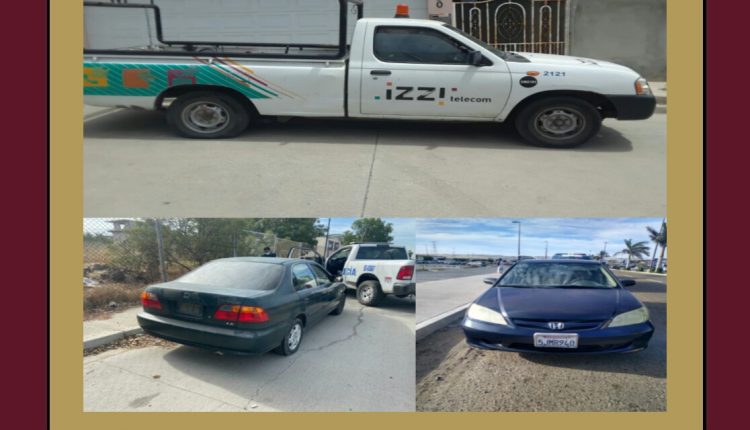 Playas de Rosarito, B. C.- Policías municipales recuperaron tres vehículos, en acciones realizadas este jueves en distintas colonias de la ciudad.