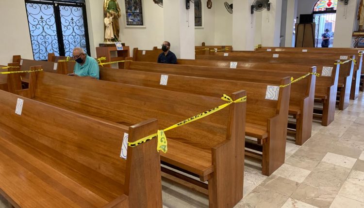 En el interior de la iglesia las bancas estarán salteadas, es decir, una banca podrá ser ocupada y una no, esto para respetar la sana distancia entre las personas, además de que al momento de pasar al frente a recibir la comunión estará se dará en la mano y no directamente en la boca.