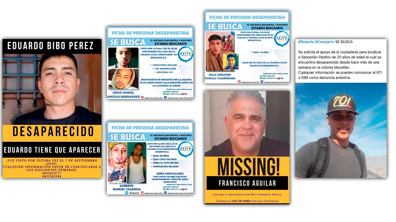 Cabe señalar que en los últimos días han desaparecido diversos hombres en Rosarito, Isaac Armando Padilla Valderrama, Josué Daniel Ángulo Hernández, Alberto Rangel Valencia, Sebastián Palafox todos ellos desaparecidos el pasado 25 de septiembre del 2020 en diversas colonias del municipio.