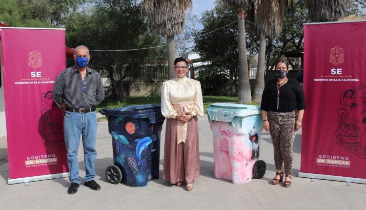 PLAYAS DE ROSARITO, BC.- La Secretaría de Educación (SE) de Baja California en coordinación con la iniciativa Garage Project Hub y la Universidad de Coachella, California en Estados Unidos, inició la entrega de contenedores de basura en escuelas de educación básica de la entidad, que forman parte de la exhibición de Art of Recycling México.