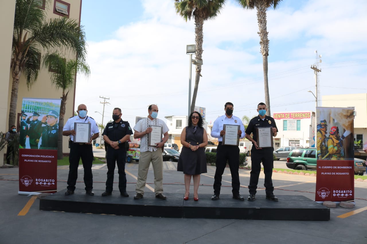 Playas de Rosarito, Baja California.- La Presidente Araceli Brown Figueredo encabezó este día un acto cívico de reconocimiento para el personal del Heroico Cuerpo de Bomberos y elementos de la Policía Municipal de Playas de Rosarito, por el esfuerzo y entrega demostrados en sus acciones, durante los pasados incendios forestales y por enfrentar el peligro durante un accidente la semana anterior donde chocaron una pipa cargada con combustible y un camión de transporte de personal.