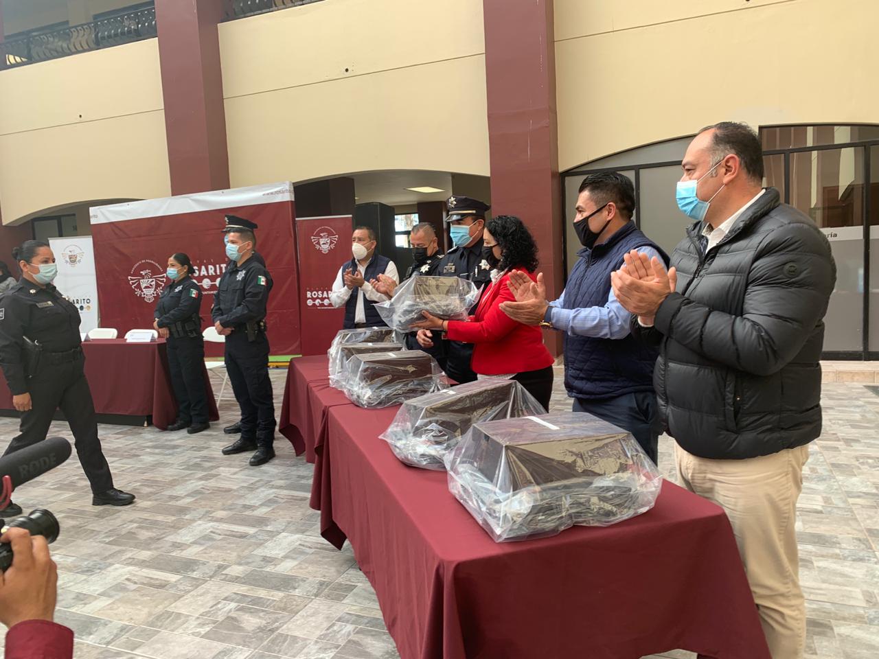 Playas de Rosarito B.C.- Un total de 500 uniformes fueron entregados esta mañana al los elementos de la policía municipal de Rosarito, uniformes con el recurso de FORTASEG, además de dos vehículos, uno para el secretario de seguridad y el director de la policía, unidades con recurso propio del ayuntamiento.