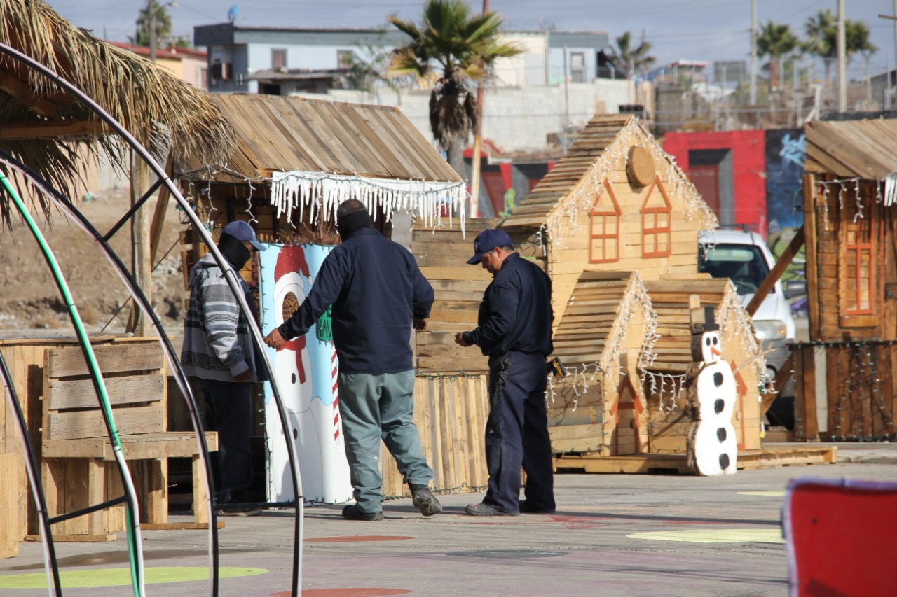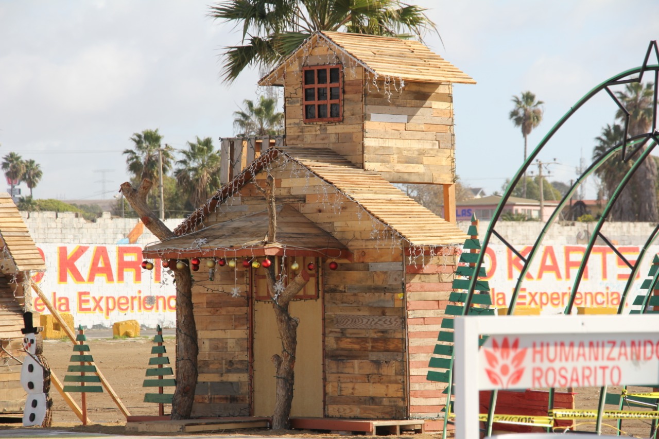 Playas de Rosarito B.C.- Con material 100% reciclado, entre madera, cartón y fierros de letreros en desuso, la dirección de servicios urbanos realizo la construcción de la villa navideña, está ubicada en los terrenos de la plaza san Fernando.