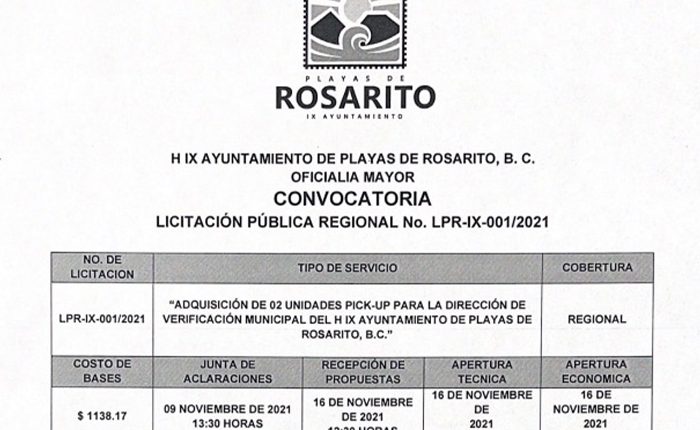 Playas de Rosarito, 2 de noviembre de 2021.- El Gobierno de Playas de Rosarito convoca a personas físicas y morales a participar en la Licitación Pública Regional No. LPR-IX-001/2021 “Adquisición de 02 unidades Pick-Up para la Dirección de Verificación Municipal del H. IX Ayuntamiento de Playas de Rosarito B. C.”.