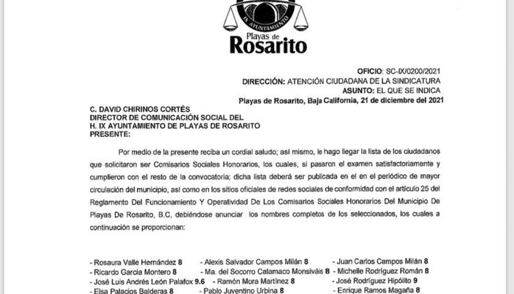 Rosarito, 21 de diciembre de 2021.- La Sindicatura Municipal del IX Ayuntamiento de Rosarito dirigido por Araceli Brown Figaredo, dio a conocer la lista de ciudadanos que se convertirán en Comisario Sociales Honorarios. Esto debido a que atendieron los requisitos de la convocatoria y aprobaron de manera satisfactoria el examen que esta implicó.