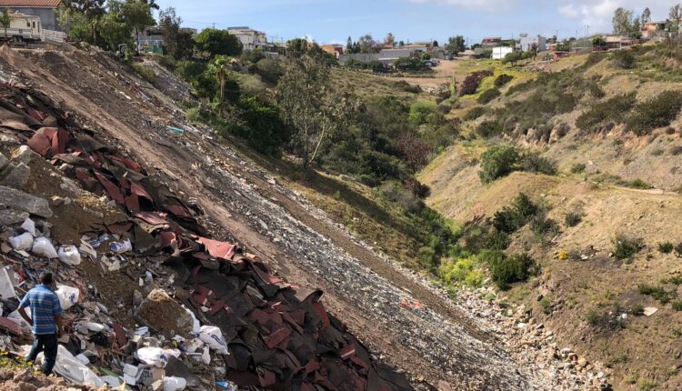 Playas de Rosarito, 22 de abril de 2022.- A un basurero clandestino en la colonia Aztlán fue a parar el tartán que ha comenzado a quitar la empresa constructora Fatpad SA de CV, la cual fue contratada para la rehabilitación total de la pista de atletismo en la unidad deportiva Andrés Luna en la colonia Reforma.