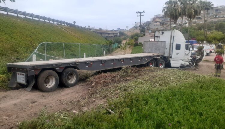 Playas de Rosarito, 17 de mayo de 2022.- Un conductor de camión tipo trailer se quedó dormido al ir circulando sobre la carretera escénica en Rosarito, por lo que perdió el control del vehículo pesado y salió disparado.