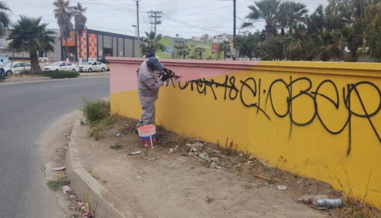 Playas de Rosarito, 23 de mayo de 2022.- El municipio cuenta con un problema grave de grafiti, aunque muchos de ellos están en bardas, algunas son de propiedad privada, sin embargo, los que se encuentran en espacios públicos como escuelas, parques, centros comunitarios etc, serán atendidos.