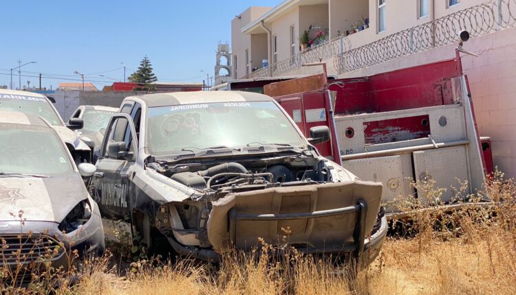 Playas de Rosarito, 29 de junio de 2022.- Vecinos de la calle Jose Haros Aguilar de la colonia Constitución piden al gobierno municipal que retire de un terreno los vehículos de su propiedad, en los que se encuentran patrullas, vehículos de bomberos, Zofemat entre otros, los cuales tienen calcomanías de ayuntamientos pasados.