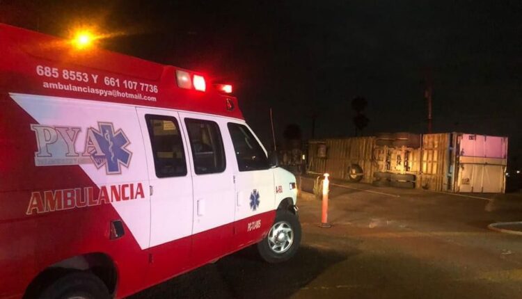 Playas de Rosarito, 13 de julio de 2022.- Un tráiler cargado de mercancía volcó la noche de este martes 12 de julio del 2022 en el entronque del bulevar 2000 y Popotla causando el cierre de circulación.