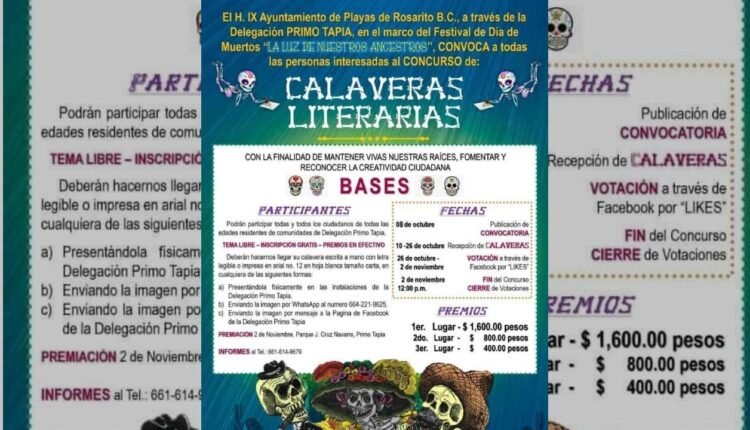 Por eso se invita a la comunidad a participar en el concurso de “Calaveras Literarias” que está abierto para todos los ciudadanos, sin importar su edad, que residen en comunidades de Primo Tapia, quienes podrán escribir una “Calavera” en tema libre, a mano y con letra legible, o bien impresa en tipografía Arial número 12 en hoja blanca tamaño carta; obras que deben presentar físicamente en la delegación, o enviar dicha imagen por medio de WhatsApp al número (664) 221 9625, o mediante un mensaje a la página de Facebook de la Delegación Primo Tapia.