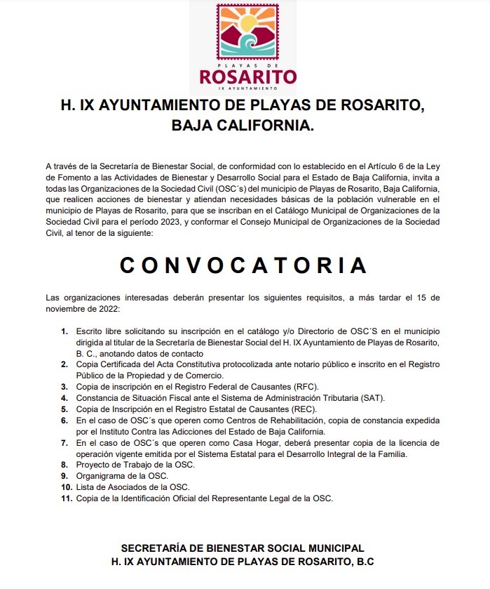 Playas de Rosarito, 25 de octubre de 2022.- Se ha dado a conocer la convocatoria dirigida a los interesados en integrarse al Catálogo Municipal de los Organizaciones de la Sociedad Civil (OSC) 2023; y en la conformación del Consejo Municipal de dichos organismos civiles.