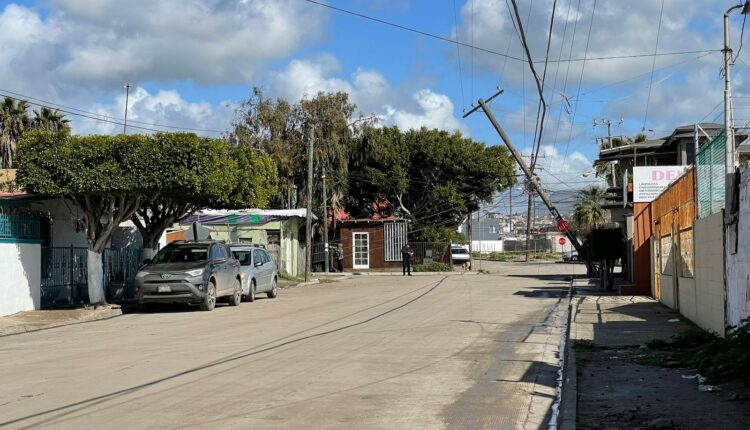 Playas de Rosarito B.C, 28 febrero 2023.- Un vehículo de transporte de oxxo al querer pasar por una calle angosta de la colonia Predios Urbanos derribó al menos 3 postes de energía eléctrica y de comunicaciones, por lo que dejó sin energía eléctrica a la zona y causando daños en una vivienda.