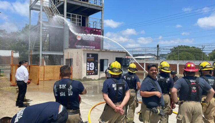 Tijuana, 15 de mayo de 2023.-La Escuela Estatal de Protección Civil (EPROC) de Baja California, en colaboración con la Dirección de Bomberos de Tijuana y la empresa Mercedes Textiles Limited, llevaron a cabo una capacitación en despliegue y patrones de ataque contra incendios.