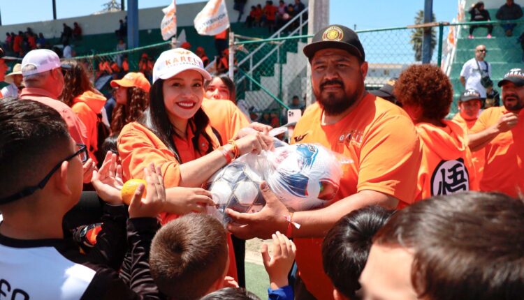Playas de Rosarito, 29 de abril de 2024.- Brindar todo el apoyo al deporte, una de las propuestas de campaña presentadas por la candidata de Movimiento Ciudadano a la presidencia municipal de Rosarito, Karely Leal frente a cientos de deportistas y familias que acudieron al torneo de fútbol “fosfo 2024” en los campos Emiliano Zapata.
