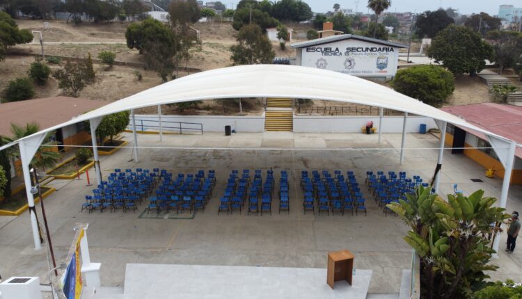 Este proyecto consta de 443 metros cuadrados de cubierta con estructura de acero y lona plastificada, que beneficia a cientos de estudiantes al protegerlos de las inclemencias del tiempo durante el desarrollo de sus actividades escolares.
