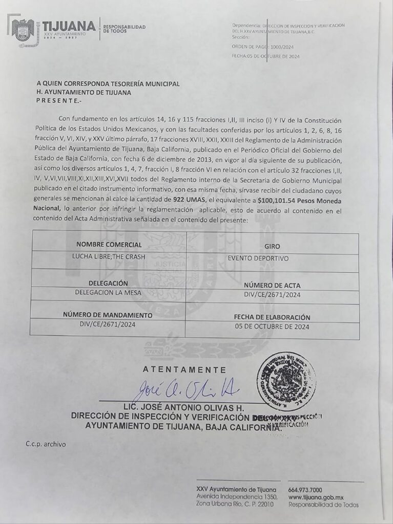El Gobierno Municipal que encabeza el Alcalde Ismael Burgueño Ruiz, reprueba estos actos y no tolera ningún tipo de violencia, en este sentido, en relación al caso en mención, el Director de Inspección y Verificación Municipal, José Antonio Olivas Heredia, informó que se sancionará con multa a la empresa responsable Promotora de Lucha Libre The Crash y notificará a la Comisión de Box y Lucha para que proceda con la penalización correspondiente.