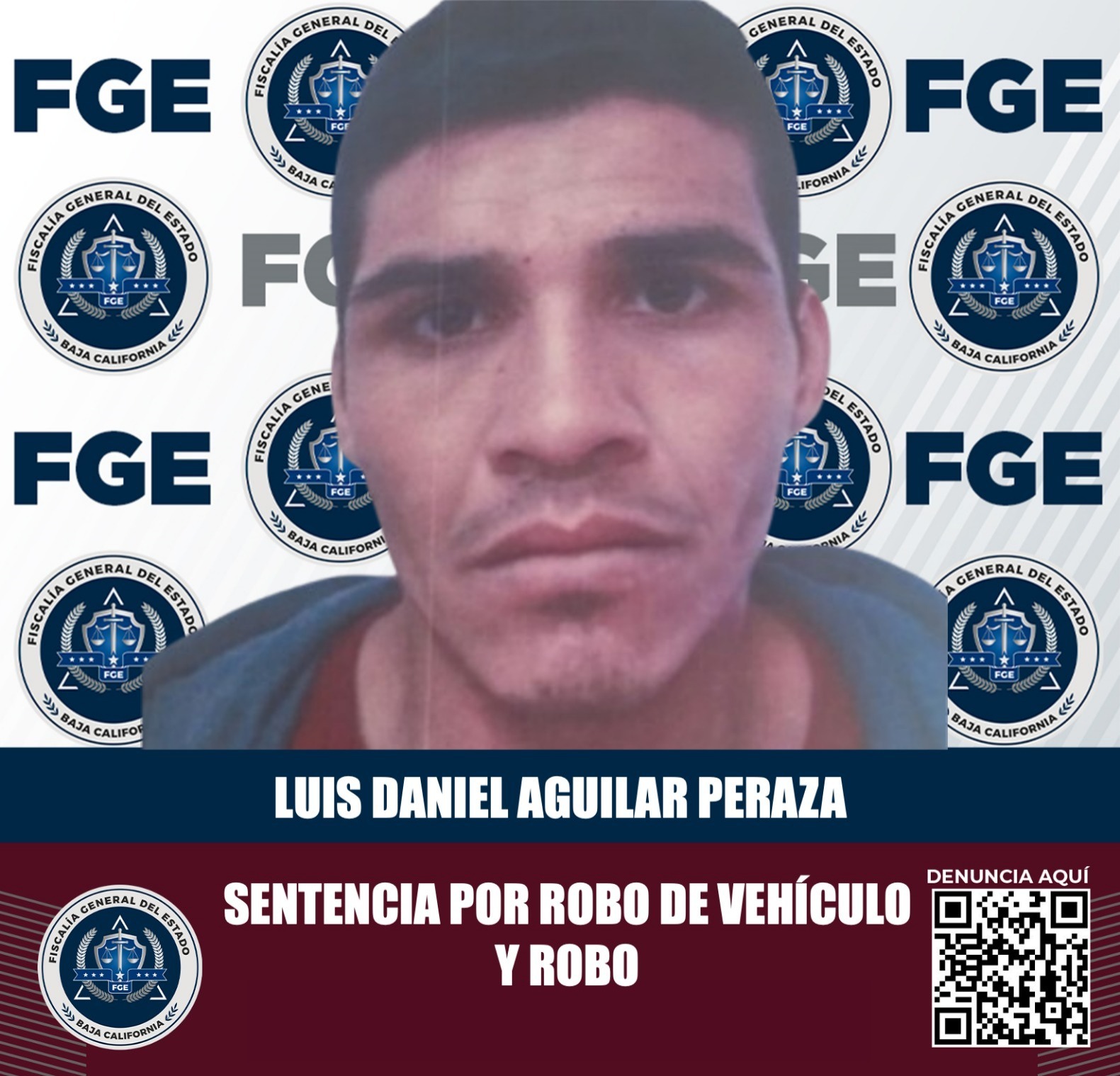 PLAYAS DE ROSARITO, BAJA CALIFORNIA A 10 DE NOVIEMBRE DE 2024.- La Fiscalía Regional de Playas de Rosarito informa que Luis Daniel Aguilar Peraza fue sentenciado a 6 años, 6 meses y 1 día de prisión, tras ser encontrado plenamente responsable del delito de robo de vehículo de motor ejecutado con violencia moral equiparada y robo.