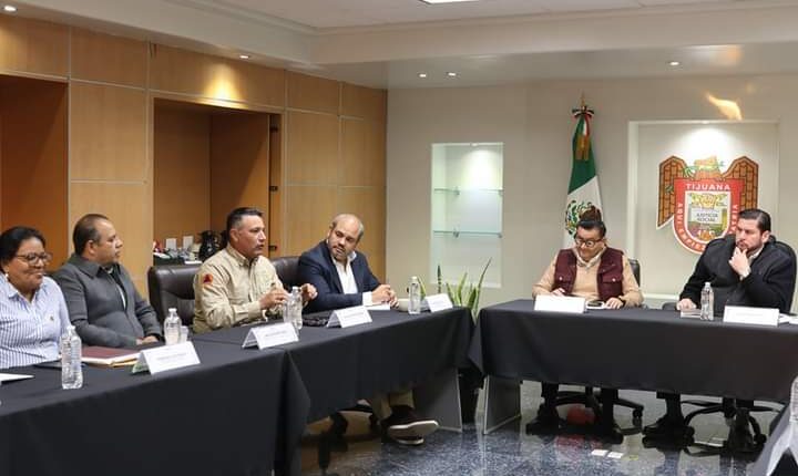 Tijuana, Baja California, a 18 de noviembre de 2024.- El Alcalde de Tijuana, Ismael Burgueño Ruiz, acompañado del Secretario de Gobierno Municipal, Arnulfo Guerrero León, encabezó una mesa de trabajo con el Director Municipal de Protección Civil, José Luis Jiménez González, y con las y los delegados municipales, a fin de establecer acciones preventivas en la ciudad, con base en el análisis de riesgo por agente hidrometeorológico.