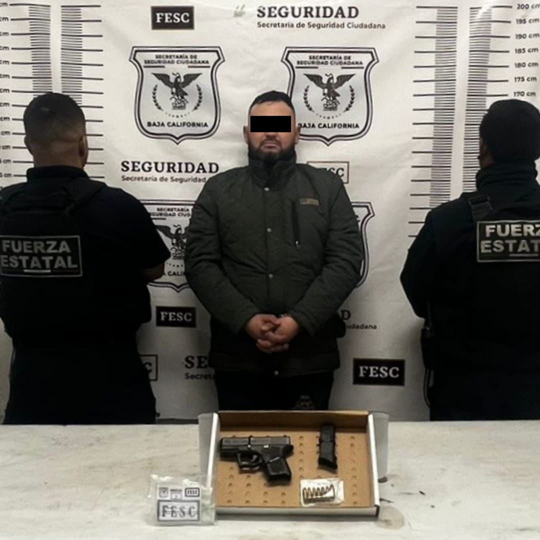 Playas de Rosarito.- Agentes de la Fuerza Estatal de Seguridad Ciudadana (FESC) de la Secretaría de Seguridad Ciudadana de Baja California (SSCBC) llevaron a cabo la detención de un hombre de 30 años, a quien se le decomisó un arma de fuego abastecida con cartuchos útiles y un paquete que contenía metanfetamina.