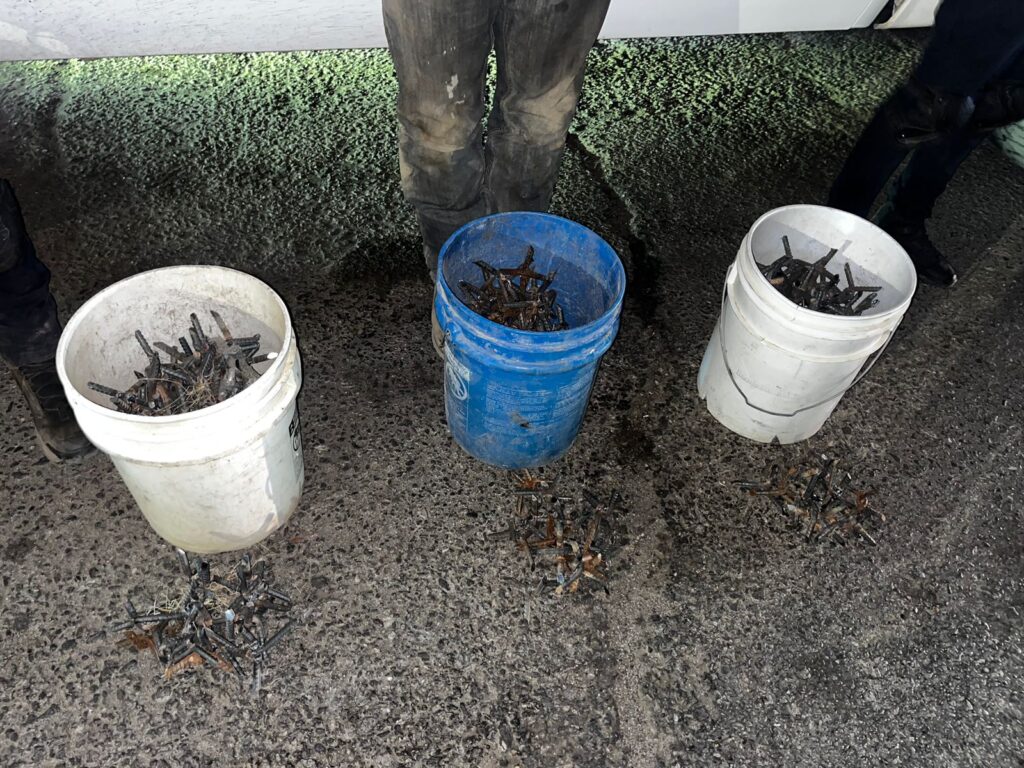 El hombre se identificó ante los agentes como Juan Francisco “N” originario de Mexicali, a quien se le realizó una inspección preventiva sin encontrarle objetos sospechosos entre sus pertenencias, sin embargo, en la cabina de la camioneta que dijo era de su prioridad, se localizaron tres cubetas llenas de “poncha llantas”.