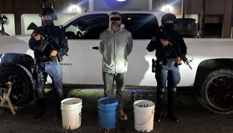 El hombre se identificó ante los agentes como Juan Francisco “N” originario de Mexicali, a quien se le realizó una inspección preventiva sin encontrarle objetos sospechosos entre sus pertenencias, sin embargo, en la cabina de la camioneta que dijo era de su prioridad, se localizaron tres cubetas llenas de “poncha llantas”.