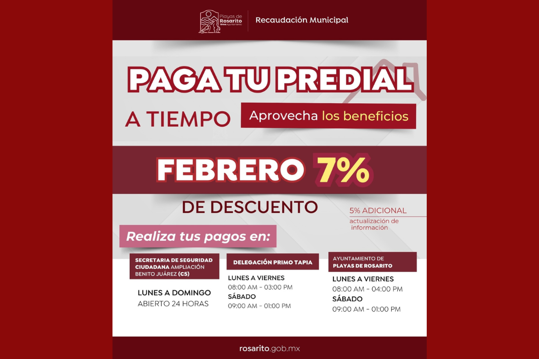 Playas de Rosarito, 06 de febrero de 2025.- El 10mo. Ayuntamiento de Playas de Rosarito, encabezado por la Presidenta Municipal, Mtra. Rocio Adame Muñoz, invitó a la ciudadanía a aprovechar el 7% de descuento vigente durante febrero en el pago del Impuesto Predial.
