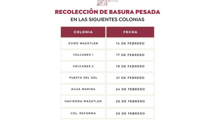 El funcionario detalló que las próximas fechas de recolección de basura son: 14 de febrero en la colonia Ejido Mazatlán; 17 en Volcanes 1, 19 en Volcanes 2, 21 de febrero en Puesta del Sol, 24 de febrero en Agua Marina, 26 en Hacienda de Mazatlán y el 28 de febrero en la colonia Reforma.