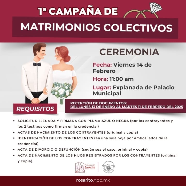 Playas de Rosarito, 10 de febrero de 2025.- El gobierno municipal encabezado por la presidenta, Mtra. Rocio Adame Muñoz informa que el plazo para la recepción de documentos para la ceremonia de “Matrimonios Colectivos 2025”, vence el miércoles 12 de febrero a las 15:00 horas.