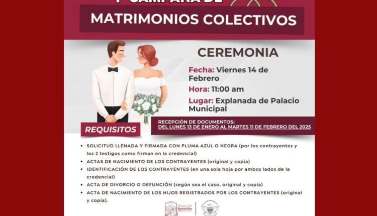 Playas de Rosarito, 10 de febrero de 2025.- El gobierno municipal encabezado por la presidenta, Mtra. Rocio Adame Muñoz informa que el plazo para la recepción de documentos para la ceremonia de “Matrimonios Colectivos 2025”, vence el miércoles 12 de febrero a las 15:00 horas.