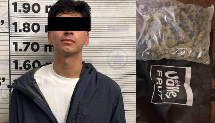 El detenido fue identificado como Adrián “N.”, de 23 años y originario de Baja California. Según el informe oficial, los agentes observaron al sujeto arrojar un objeto al suelo al notar la presencia de la patrulla. Tras inspeccionar el artículo, se percataron de que se trataba de una bolsa negra que contenía un paquete con hierba verde seca con las características de la marihuana.