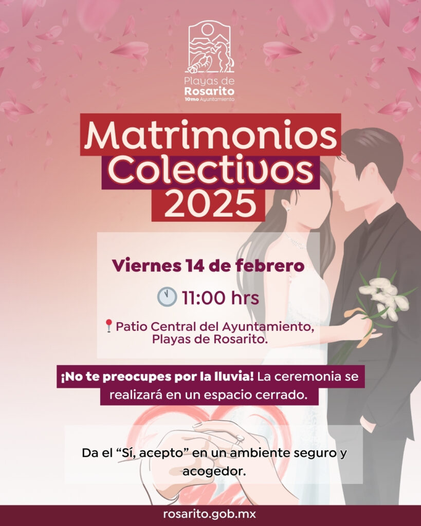 Playas de Rosarito, 13 de febrero de 2025.- El 10mo. Ayuntamiento de Playas de Rosarito, que preside la Mtra. Rocio Adame Muñoz, informó a las y los contrayentes que participan en la campaña “Matrimonios Colectivos 2025”, que la ceremonia civil se llevará a cabo el próximo viernes 14 de febrero a las 11:00 horas en el patio central del edificio municipal.