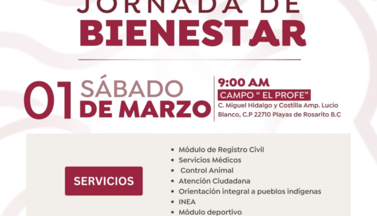 Viernes 28 de febrero de 2025.- El Gobierno Municipal, liderado por la presidenta Mtra. Rocio Adame Muñoz, a través de la Secretaría de Bienestar Social, extiende una cordial invitación a la comunidad rosaritense para participar en la próxima Jornada de Bienestar que se llevará a cabo el sábado 01 de marzo en Campo El Profe, ubicado en la colonia Ampliación Lucio Blanco.
