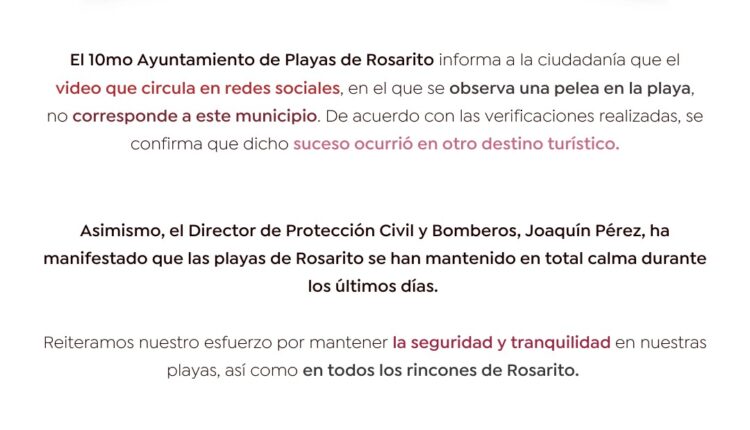 De acuerdo con las verificaciones realizadas, el incidente ocurrió en otro destino turístico. Joaquín Pérez, director de Protección Civil y Bomberos, afirmó que las playas de Rosarito han permanecido en calma en los últimos días. El gobierno municipal reiteró su compromiso con la seguridad y exhortó a la ciudadanía a verificar la información antes de compartirla en redes.