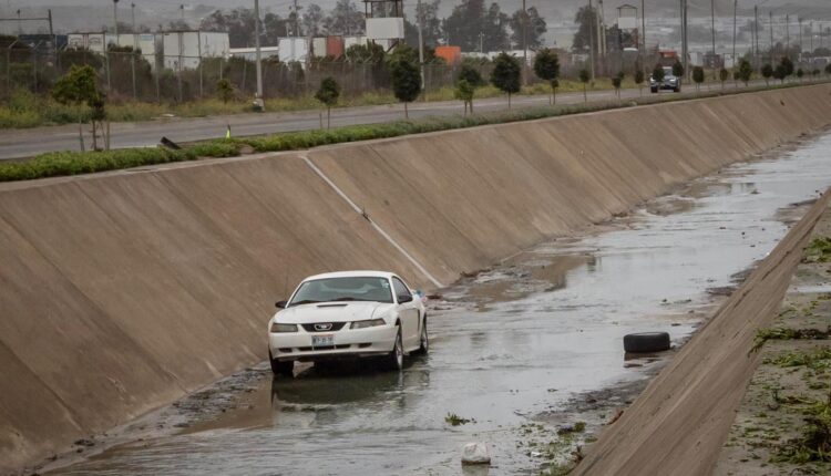 Tijuana, B.C. — Las lluvias ligeras que han caído sobre la ciudad continúan dejando estragos en la vialidad. La madrugada de este viernes, un vehículo Ford Mustang terminó dentro del canal pluvial ubicado en el bulevar Los Olivos Norte, en el parque Industrial El Florido.