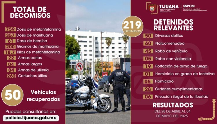 Tijuana, Baja California a 6 de mayo de 2025.- La Secretaría de Seguridad y Protección Ciudadana Municipal (SSPCM), sigue ganando terreno en labores de prevención y recuperación de la paz y la tranquilidad de la ciudad, con la detención de personas por diversos delitos, y con el decomiso de armas y de drogas, tan solo en el periodo del 28 de abril al 4 de mayo del 2025.