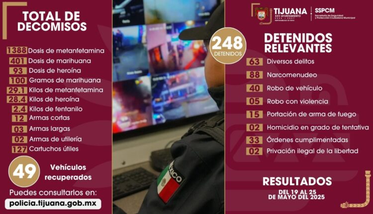 Tijuana, Baja California, 27 de mayo de 2025. Resultado del fortalecimiento de las acciones preventivas en materia de seguridad implementadas en el gobierno del presidente Ismael Burgueño Ruiz, la Secretaría de Seguridad y Protección Ciudadana Municipal (SSPCM), informa que durante la semana del 19 al 25 de mayo, fueron detenidas 248 personas presuntamente vinculadas a diversos delitos, así como el aseguramiento de armas de fuego y sustancias ilícitas.