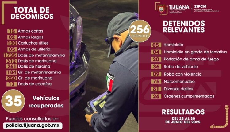 Tijuana, Baja California, a 30 de junio de 2025. Como parte de la estrategia de seguridad impulsada por el presidente municipal, Ismael Burgueño Ruiz, la Secretaría de Seguridad y Protección Ciudadana Municipal (SSPCM), aseguró a 256 personas como presuntas responsables de diversos delitos, en el periodo del 23 al 30 de junio, durante las primeras horas del día.